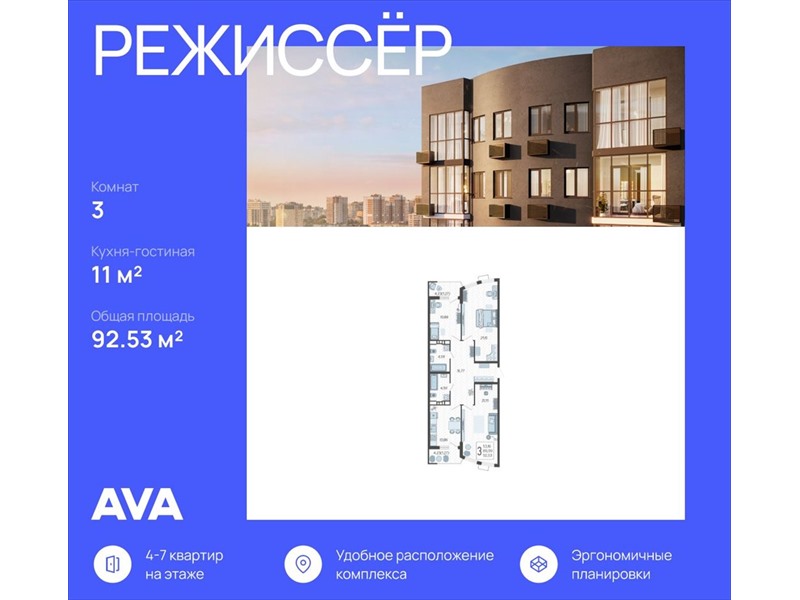 | Продается 3-комнатная квартира в ЖК "Режиссёр" в доме (Литер 4), общей площадью 92.53 кв.м., на 17 этаже. Без отделки, но с возможностью заказать ремонт.
