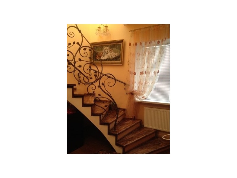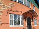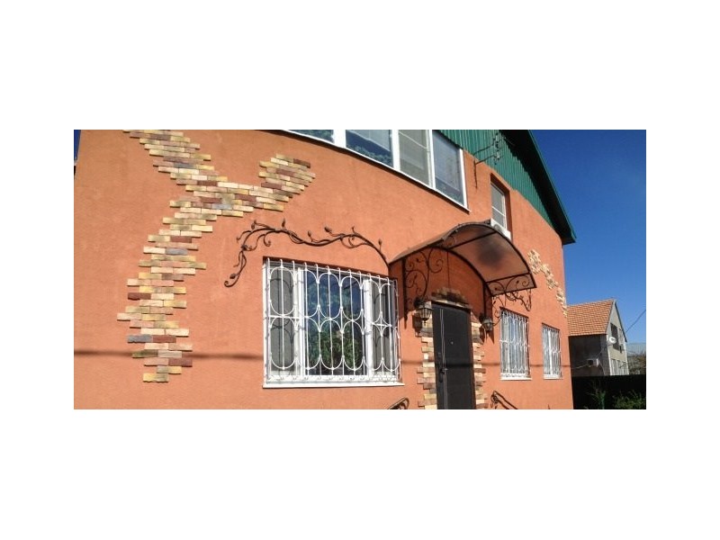 Дом утеплен экструдированными полистероловыми плитами, нанесена декоративная штукатурка Teracco, декорирован кирпичиками и кованными элементами.