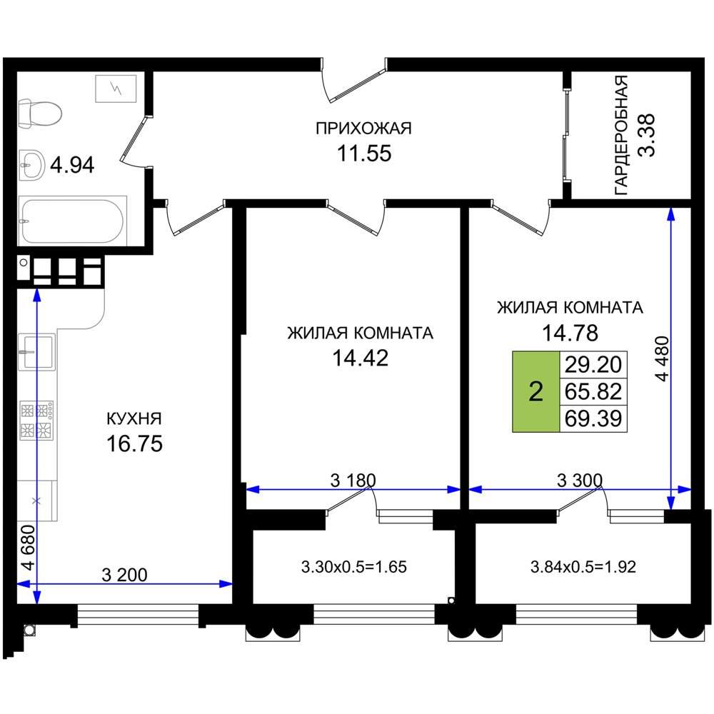 общая 69,39 м2, жилая 29,2 м2, кухни 16,75 м2 |