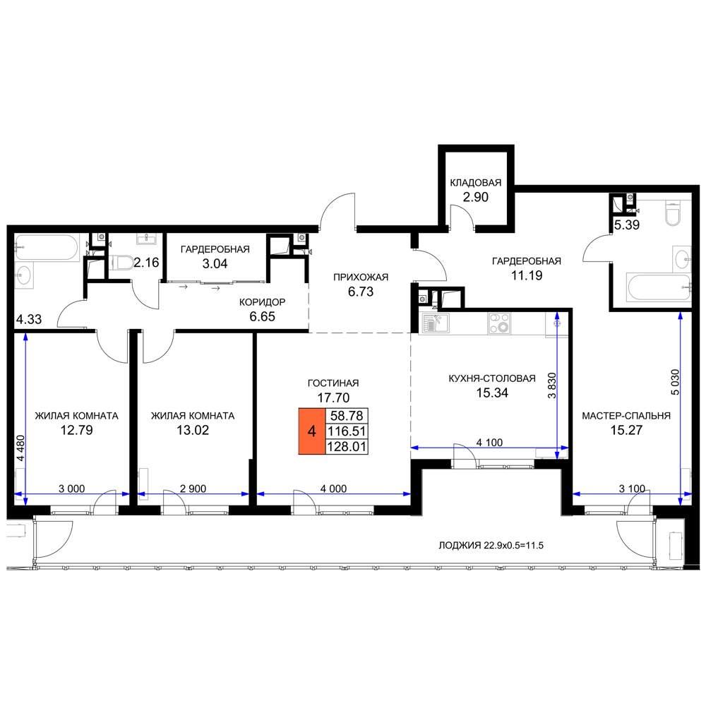 общая 128,8 м2, жилая 58,78 м2, кухни 15,34 м2 |