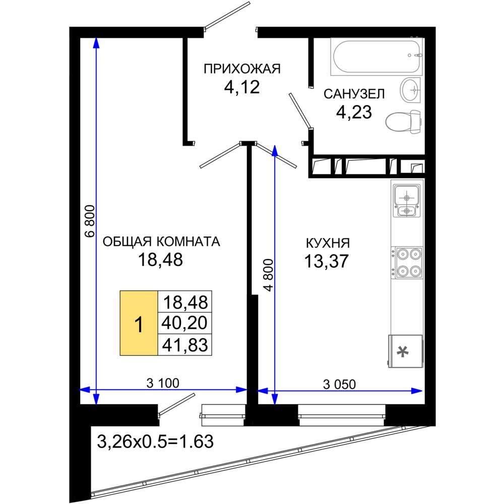 общая 41,83 м2, жилая 18,48 м2, кухни 0 м2 |