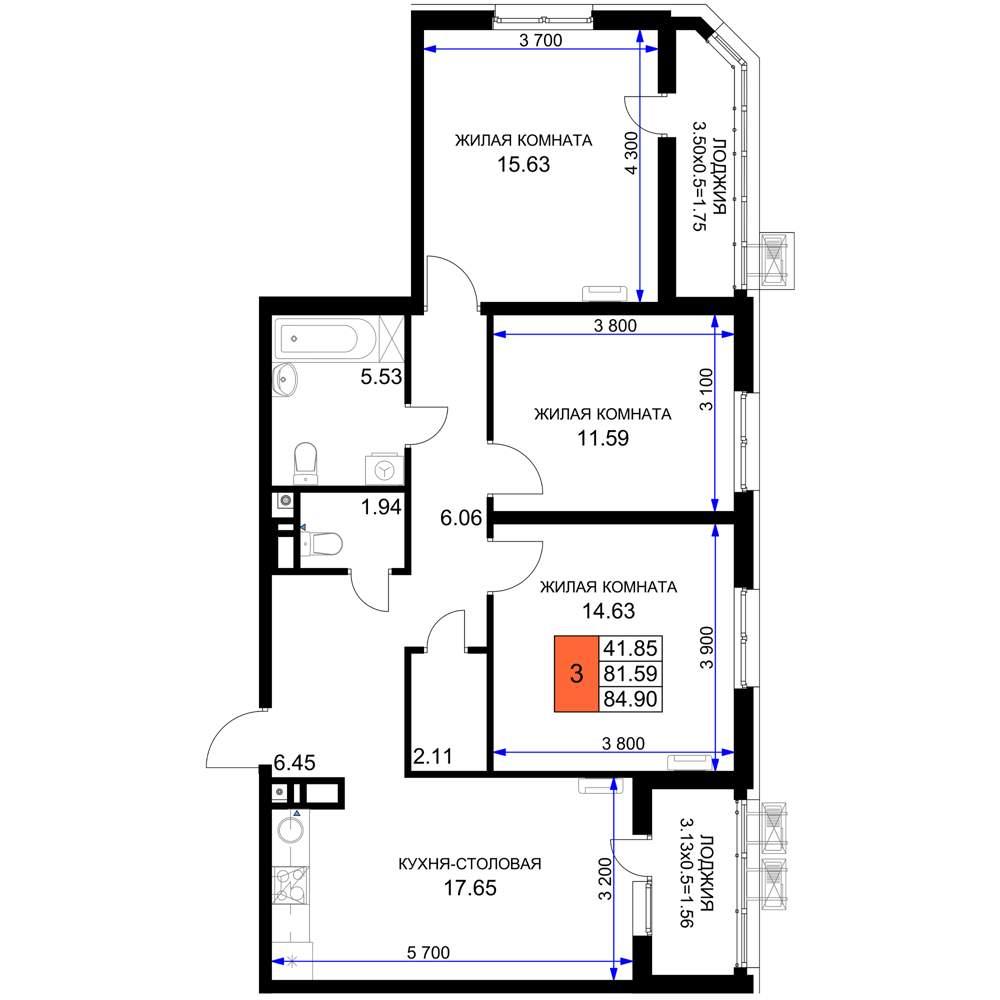 общая 84,9 м2, жилая 41,85 м2, кухни 17,65 м2 |