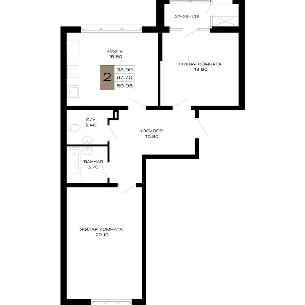 общая 69,95 м2, жилая 33,8 м2, кухни 16,17 м2 |