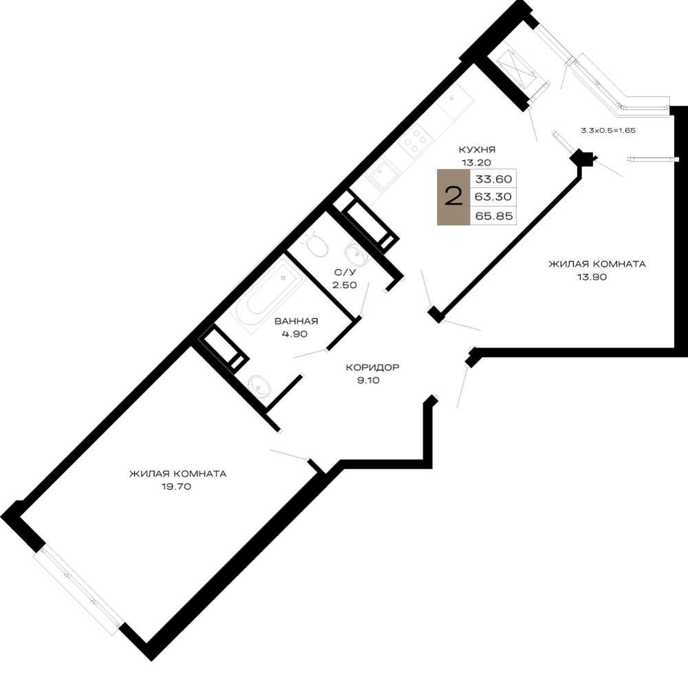 общая 65,85 м2, жилая 34,25 м2, кухни 13,92 м2 |