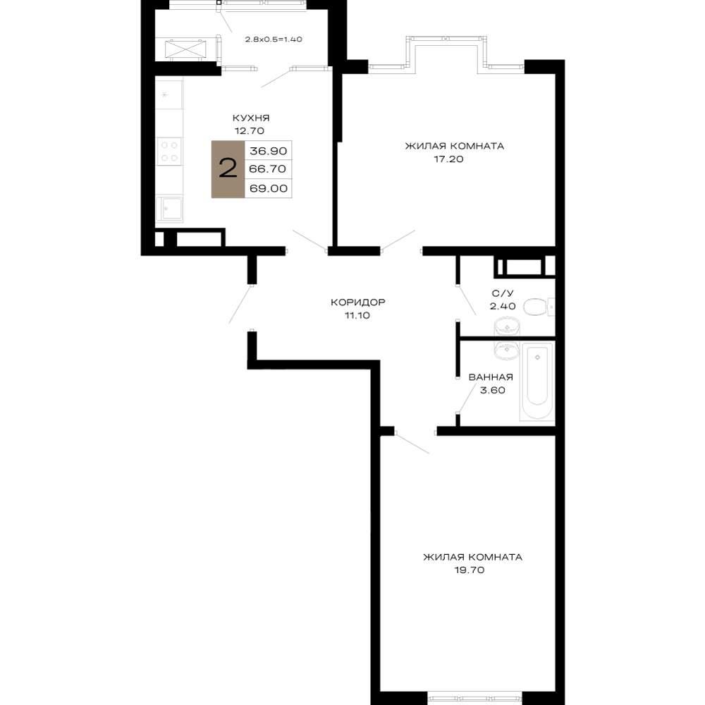 общая 69 м2, жилая 36,65 м2, кухни 12,84 м2 |