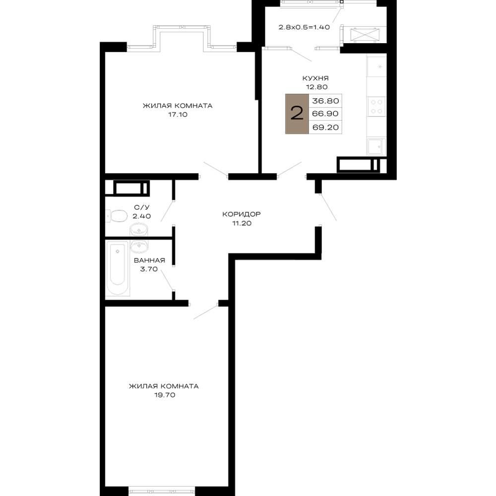 общая 69,2 м2, жилая 36,65 м2, кухни 12,84 м2 |