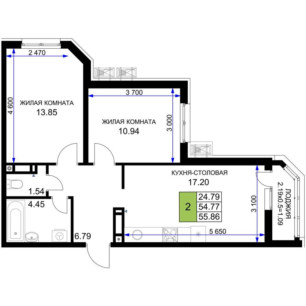 общая 55,86 м2, жилая 24,79 м2, кухни 17,2 м2 |