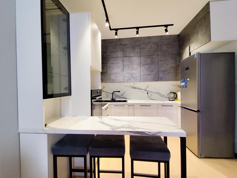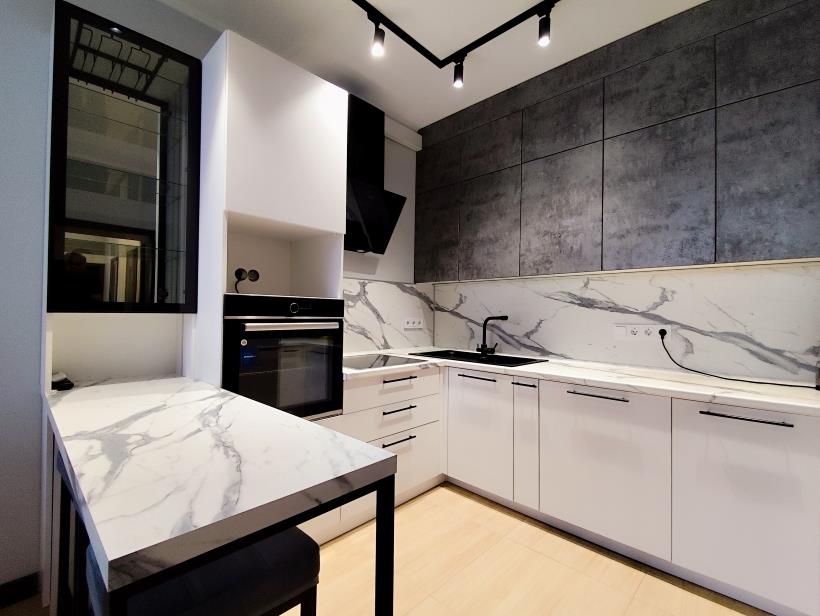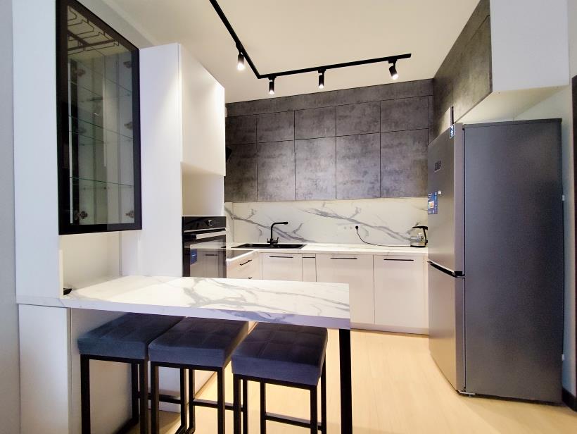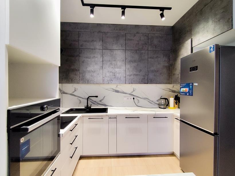 В кухне есть и варочная поверхность с духовкой, и посудомоечная машина, что очень выручит любую хозяйку от утомительного мытья посуды.
