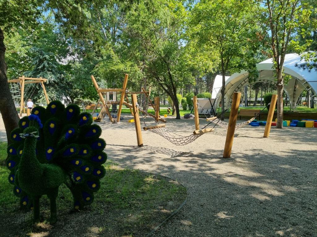Парковая зона отеля вмещает в себя: дорожки для прогулок, детскую площадку, спортивную зону wоrkоut с тренажерами на открытом воздухе, настольный теннис, мангальную зону с беседками.