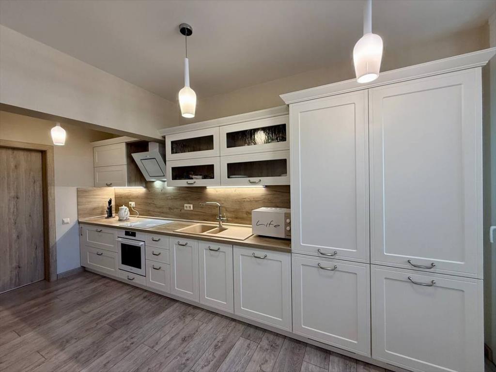На кухне-гостиной: кухонный гарнитур со встроенной бытовой техникой (холодильник, посудомоечная машина), большой удобный раздвижной диван и кресло-кровать