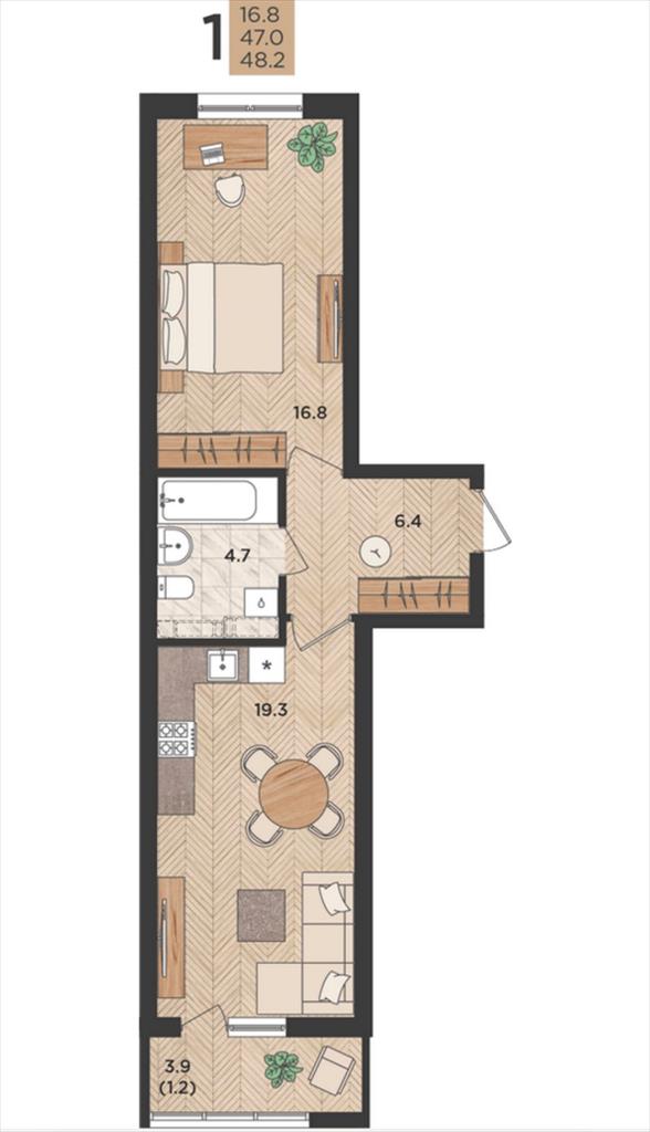 Квартира просторная и светлая, с кухней гостиной 19,3 кв. м., санузлом 4,7 кв. м., спальней 16,8 кв. м., прихожей 6,4 кв. м. и просторной лоджией .