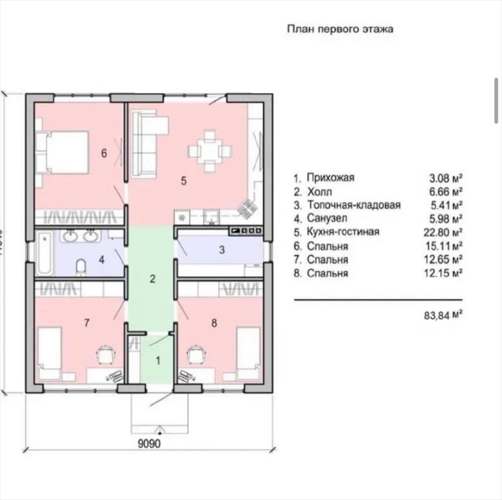Дом, внутренней площадью 91,4 м2 (размер 11,3 м х 11,96 м):